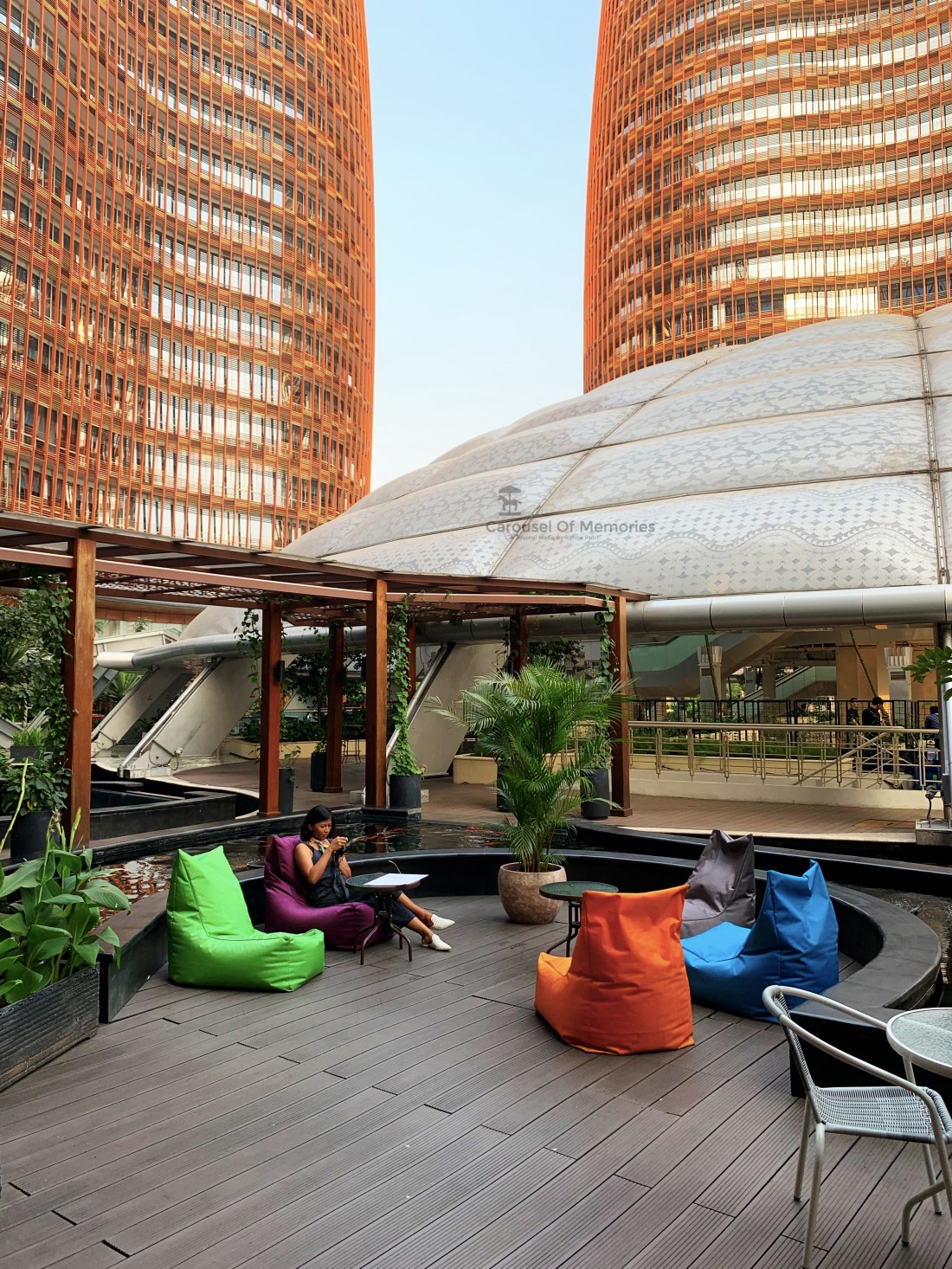 Jam terbaik mengunjungi : 4 – 6 sore. Kami dapat bias bias cahaya senja yang memantul dari kaca dan jatuh ke pohon dan taman, enak banget! Kalo siang mungkin aga panas kali ya… tapi kalian bisa juga ngadem di area indoornya di bagian bawah. Ini beberapa foto yang mewakili, area supermarket juga di bawah sini.